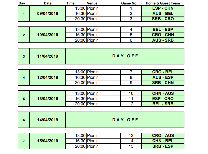 Naša reprezentacija na otvaranju šampionata 9. aprila igra protiv Hrvatske sa početkom u 20 sati i 30 minuta. Dan kasnije rival srpskim hokejašima biće Australija, a taj meč na programu je od 20 sati. Za četvrtak, 11. april predviđen je slobodan dan, a u trećem kolu (petak, 12. april) Srbija igra protiv Kine (20 sati). U subotu 13. aprila Srbija će odmeriti snage sa Belgijom (20 sati), u nedelju je drugi slobodan dan, a u poslednjem kolu u ponedeljak 15. aprila rival nam je Španija (20 sati).